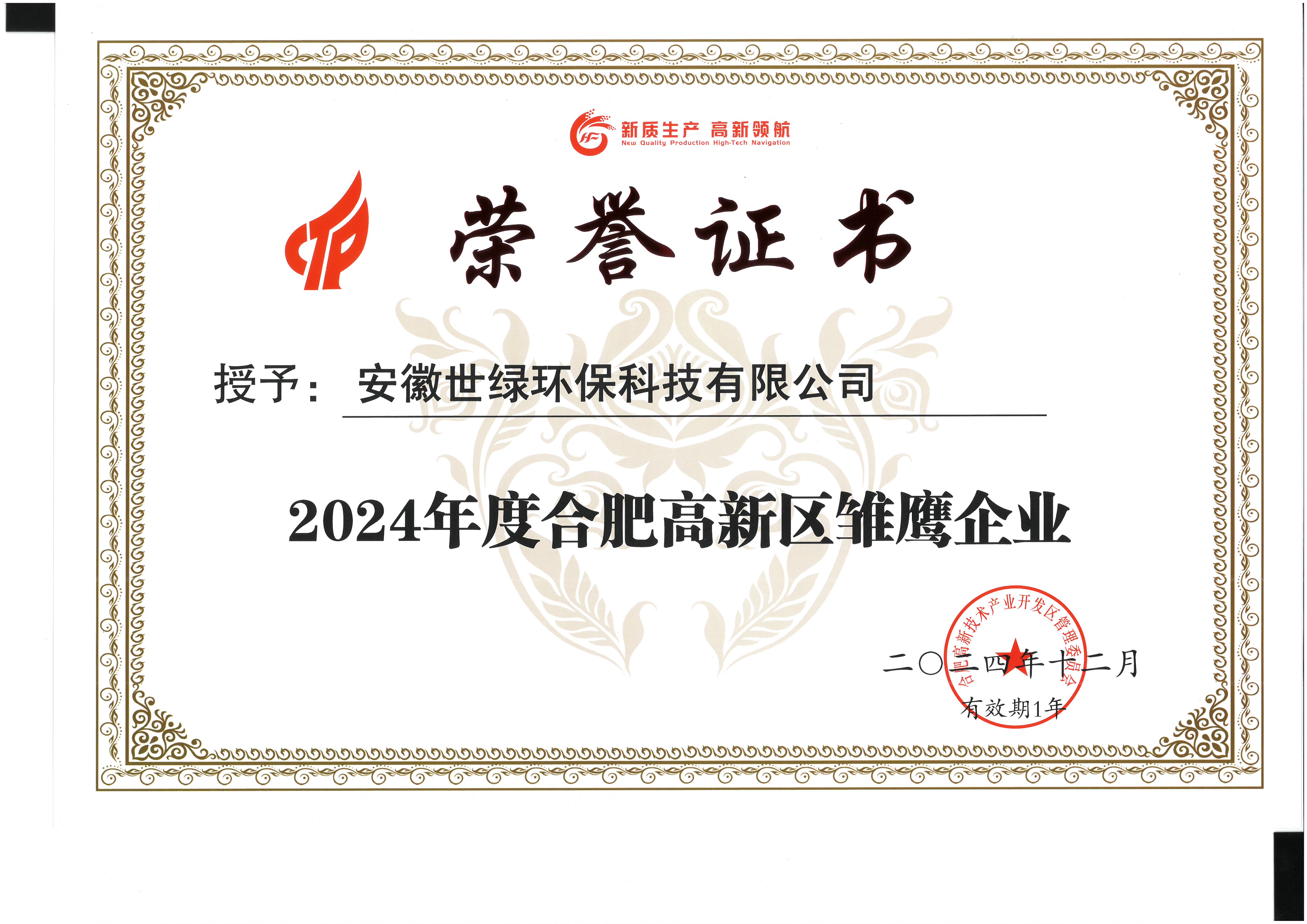 在2024年的尾聲,安徽世綠環保科技有限公司憑借其卓越的創新能力和在環保領域的杰出貢獻,榮獲了“2024年合肥高新區新質生產力企業”的稱號。這一榮譽不僅是對世綠環??萍奸L期以來努力的肯定,更是對其在推動環保產業發展、促進生態文明建設方面所做貢獻的高度認可。