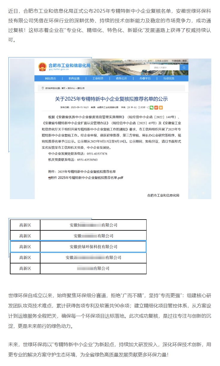世綠環保成功通過“安徽省專精特新中小企業”復核,以專業守護綠水青山!
